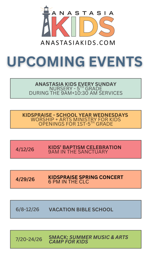 The Anastasia Kids Children’s Ministry serves children in Grades 1-5 through our Sunday and midweek programs, teaching the Bible in a way that addresses real issues our children are facing in this stage of their life. They will experience energetic and interactive worship, engage in games and activities and have focused time with loving leaders… Continue reading ELEMENTARY