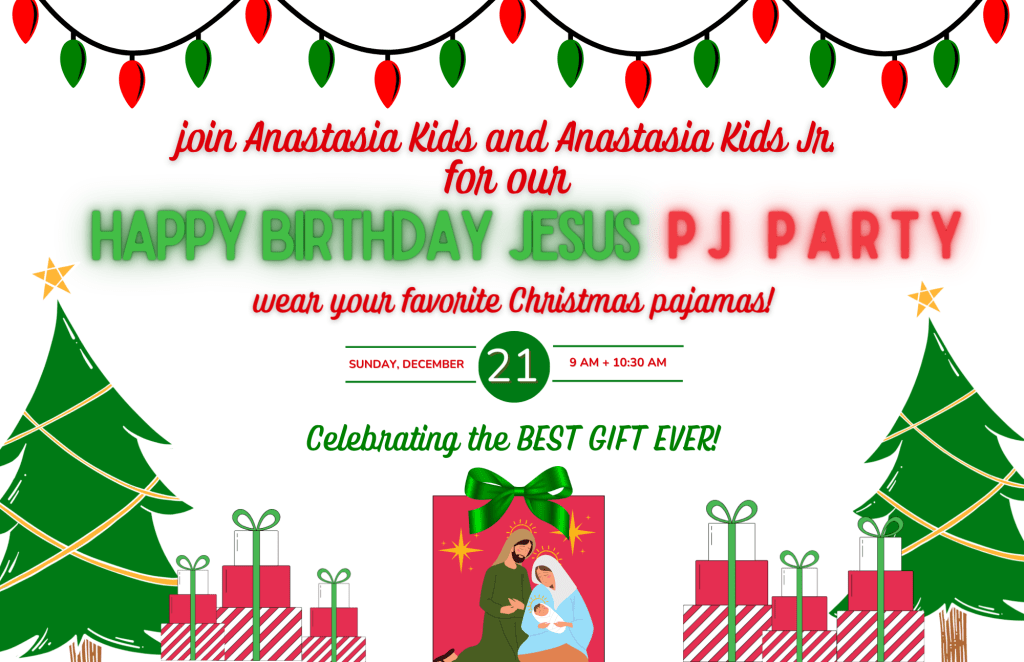 Happy Birthday Jesus Party AKids and AKids jr. will celebrate Jesus with a big HAPPY BIRTHDAY on Sunday, December 21st, during the 9:00 am and 10:30 am services. We invite all volunteers and children to come dressed in their Christmas pajamas! Share this: Click to share on X (Opens in new window) X Click to share on Facebook (Opens in new window) Facebook Like Loading...